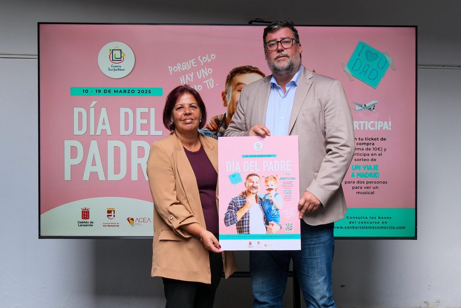 En la mañana de hoy lunes 10 de marzo, en el patio del teatro municipal, se presentaba la campaña que el área de comercio del Ayuntamiento de San Bartolomé ha lanzado la campaña «Día del Padre» con el objetivo de dinamizar las zonas comerciales del municipio. Por cada compra superior a 10 euros en los comercios adheridos, los clientes entrarán en el sorteo de un viaje a Madrid para dos personas, que incluye entradas para un musical. Una campaña donde se han sumado 58 comercios del municipio.